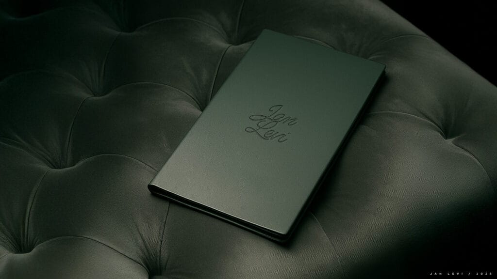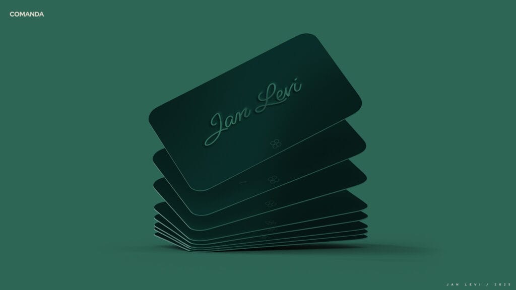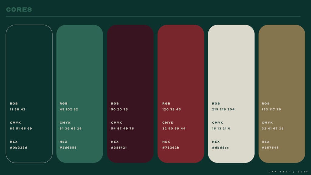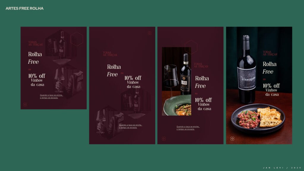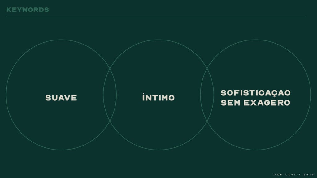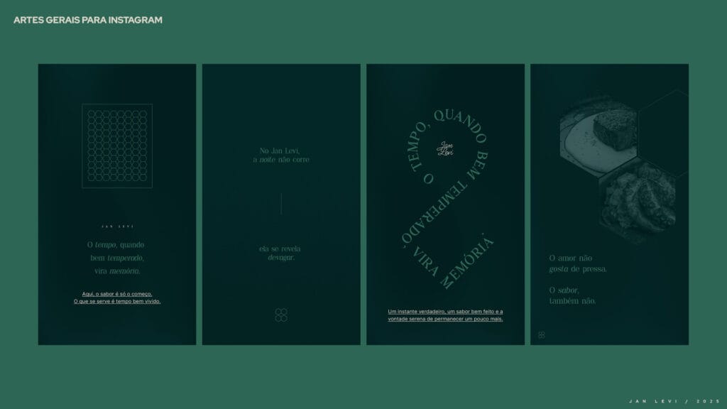 A composição apresenta uma hierarquia visual discreta, que conduz o olhar com naturalidade, reforçando a ideia de uma marca que não impõe, apenas convida. O uso sutil do itálico confere destaque com leveza, adicionando uma camada sensorial à tipografia e estabelecendo um ritmo visual que respira. Já o ícone em forma de hexágono, discreto e familiar dentro do ambiente Jan Levi, atua como uma assinatura visual elegante e como ponte simbólica entre o espaço físico e o universo gráfico da marca. A ausência de excessos valoriza o espaço em branco, dando uma sensação de equilibrio e sutileza as artes.