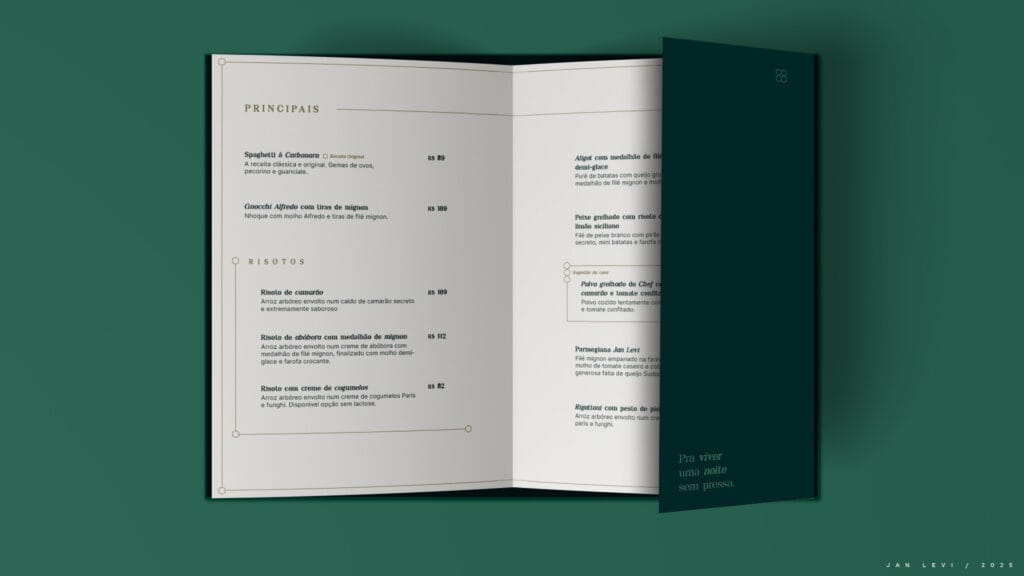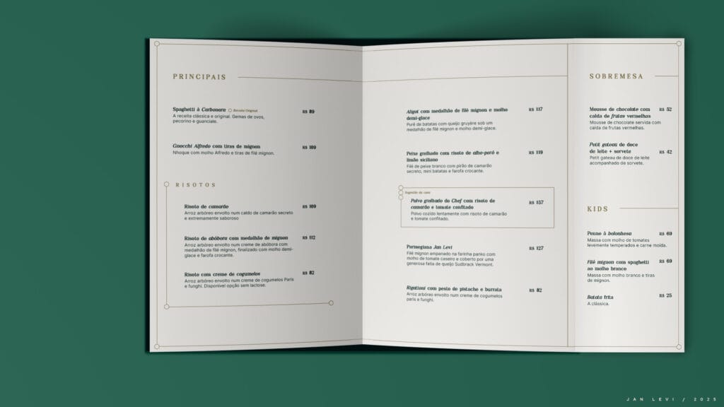 No impresso, o cardápio era apenas uma lista, pratos empilhados. Faltava estratégia, narrativa, ritmo visual. Nenhuma engenharia de cardápio. Nenhuma presença da marca. Era como se o sabor estivesse ali, mas sem convite à primeira mordida.